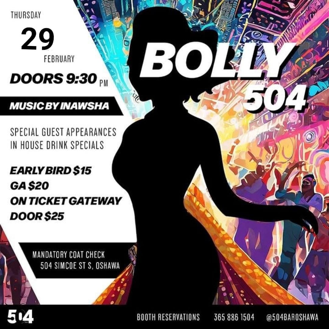 504 BAR Presents BOLLY 504 inside 504 BAR. All the Bollywood hits you know and love. Come party the night away with the Best Bollywood DJ in the East, DJ INAWSHA. Come party inside the newest and hottest nightclub in Oshawa. IG #504baroshawa / 365-886-1504