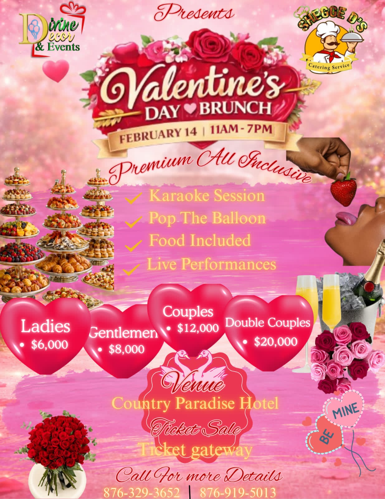 Divine Decor &Events/ Shegge D's Catering Services Presents an, All Inclusive Valentine's Day brunch at The Country Paradise Hotel, from 11am-7pm, (Come Out With Love and Find Love). Karaoke session and live pop the balloon segment , Rooms are also available for booking, Contact us today at +1(876) 329-3652 /919-5013.