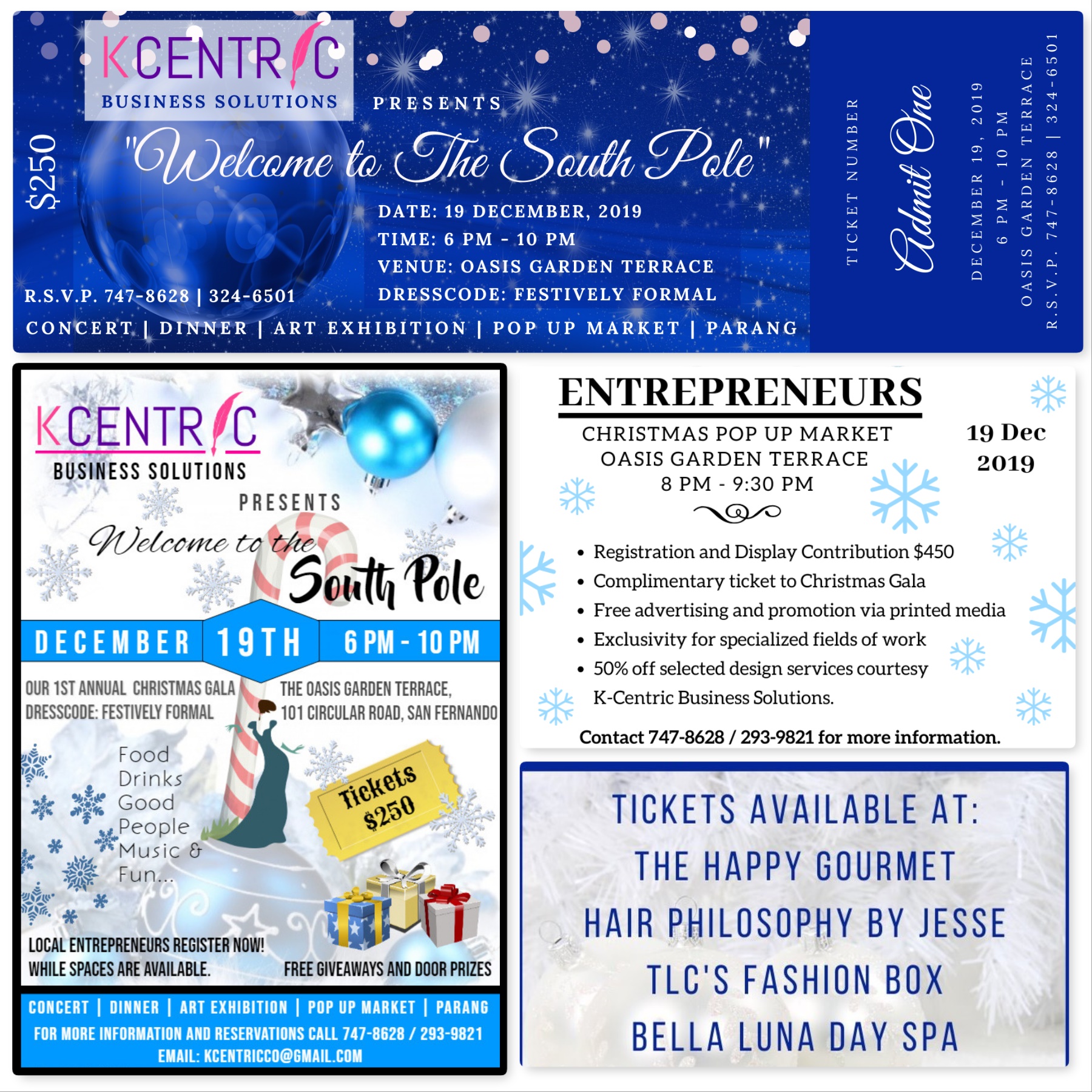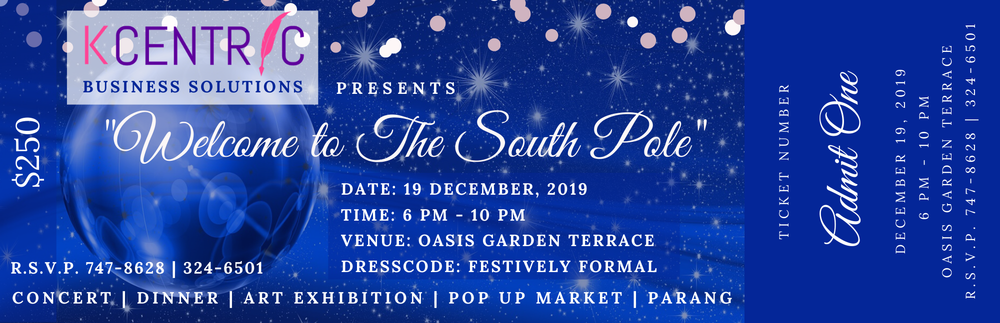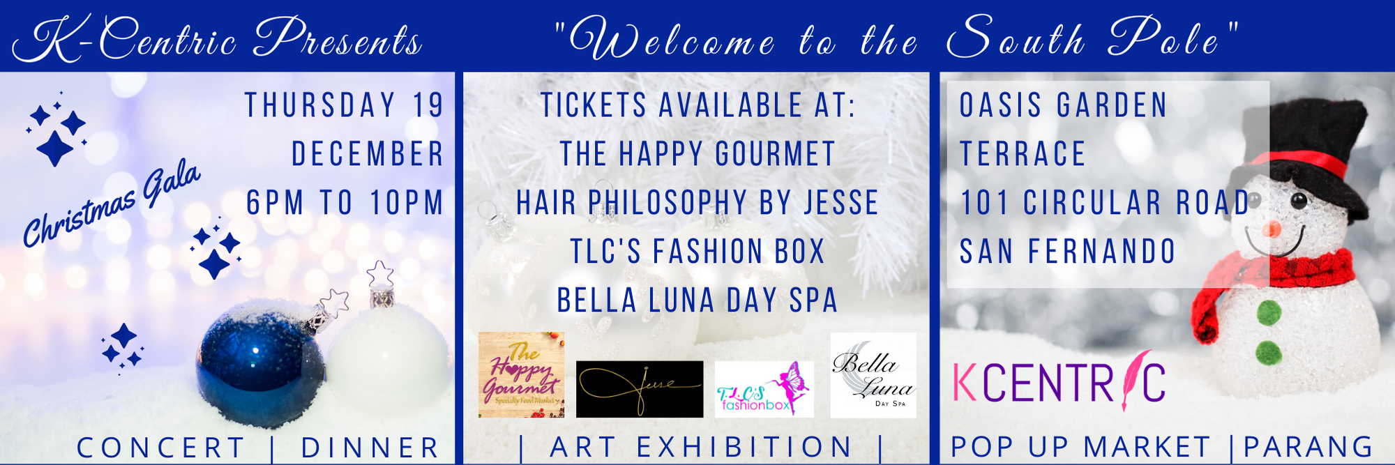 K-Centric Business Solutions presents "Welcome to the South Pole." A Christmas event meant to warm the heart and soul. Come out and enjoy this All Inclusive event, concert, dinner, pop up shop, art exhibition and parang by La Fuente de la Cancion. This event is meant for the visionaries of our country, the mature businessmen and the local entrepreneurs who have rode the tide to get them where they are. We understand how important growing networks are and this exclusive event brings us all together for that purpose.