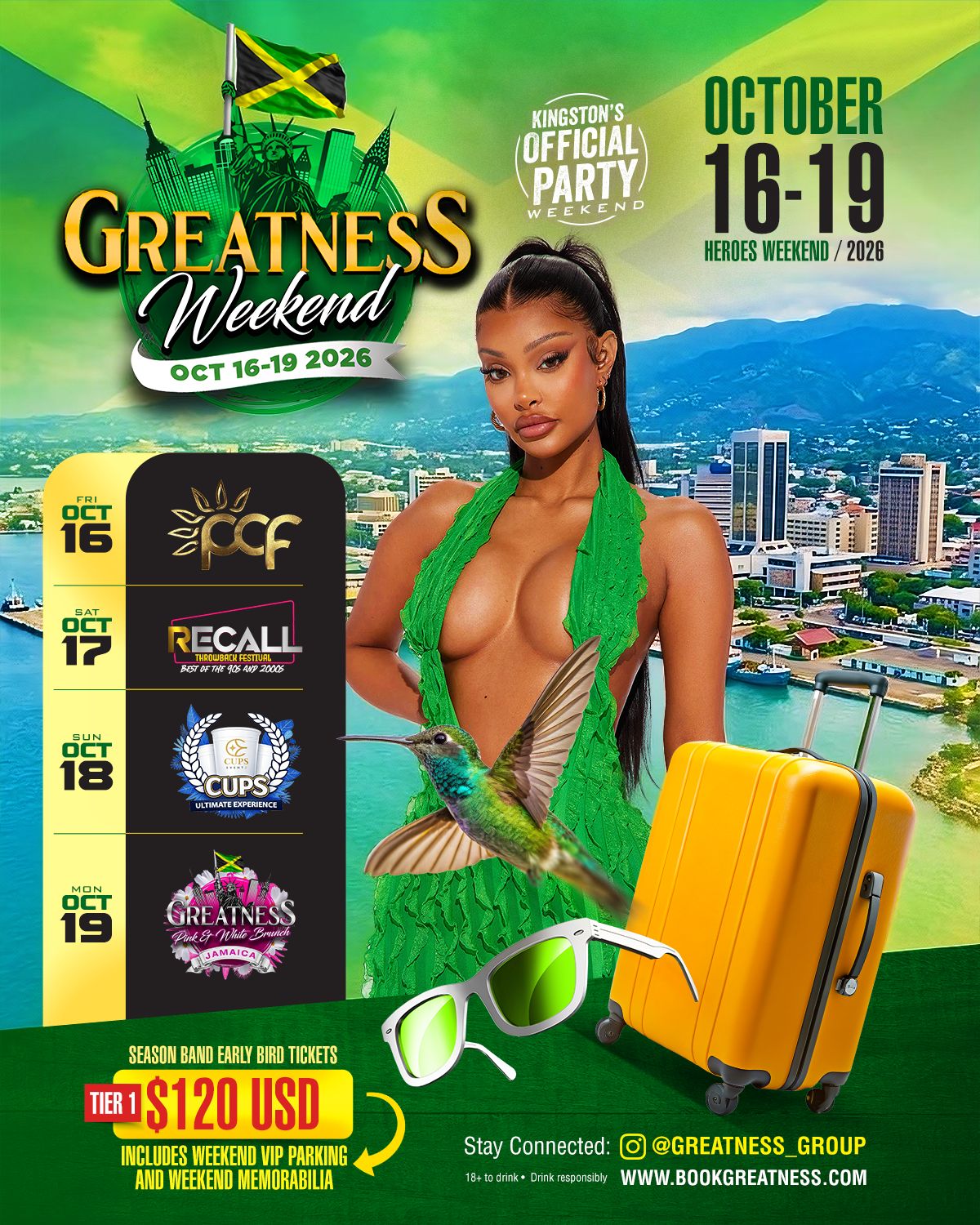 Greatness Weekend is Kingston, Jamaica’s official Heroes Weekend entertainment series, delivering a four-day, multi-event experience delivering a curated four-day lineup of signature events—PCF: Pool Cooler Fete, Recall: Throwback Festival, CUPS: Premium Blue & White Event, and the Greatness Pink & White Brunch from October 16–19, 2026.