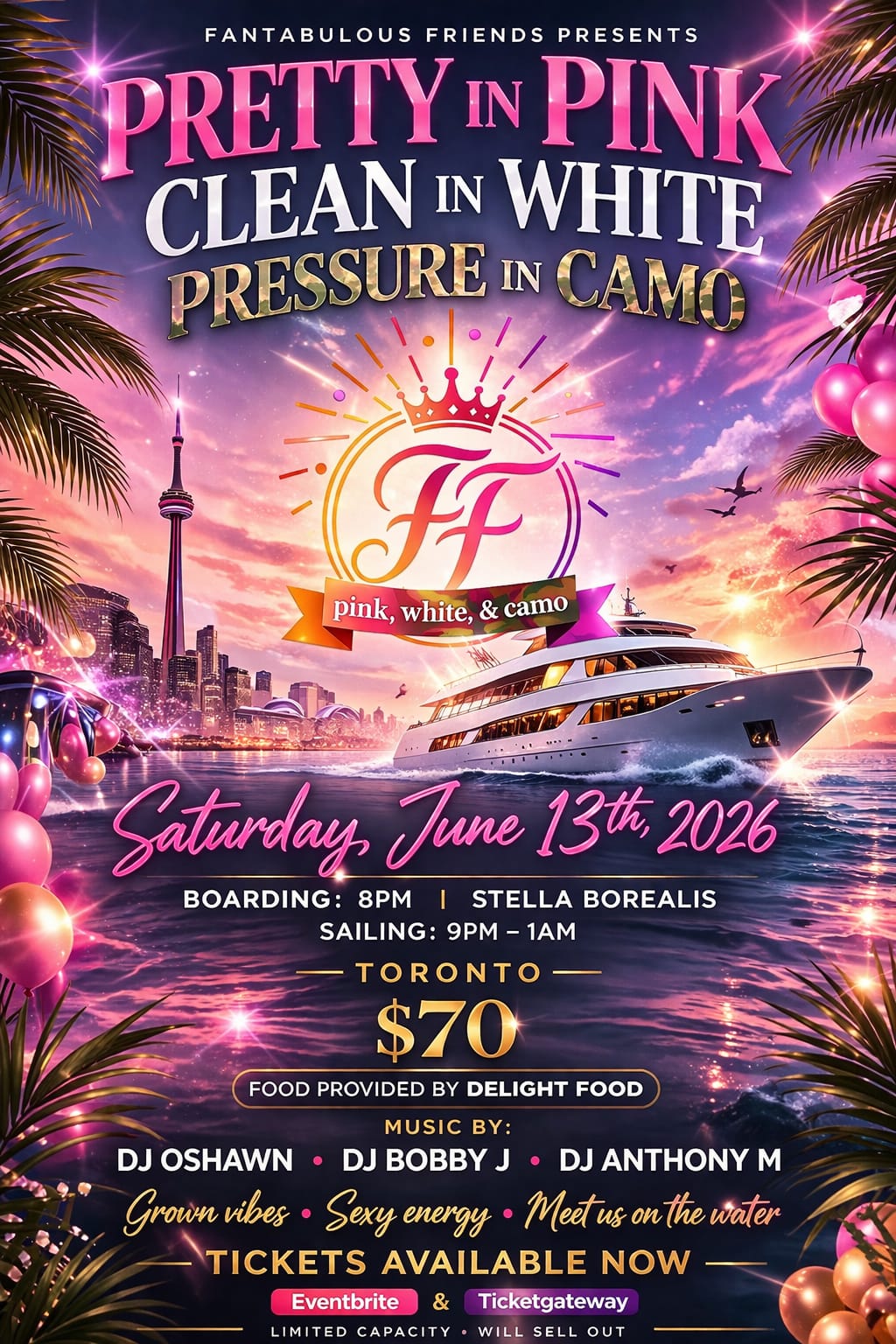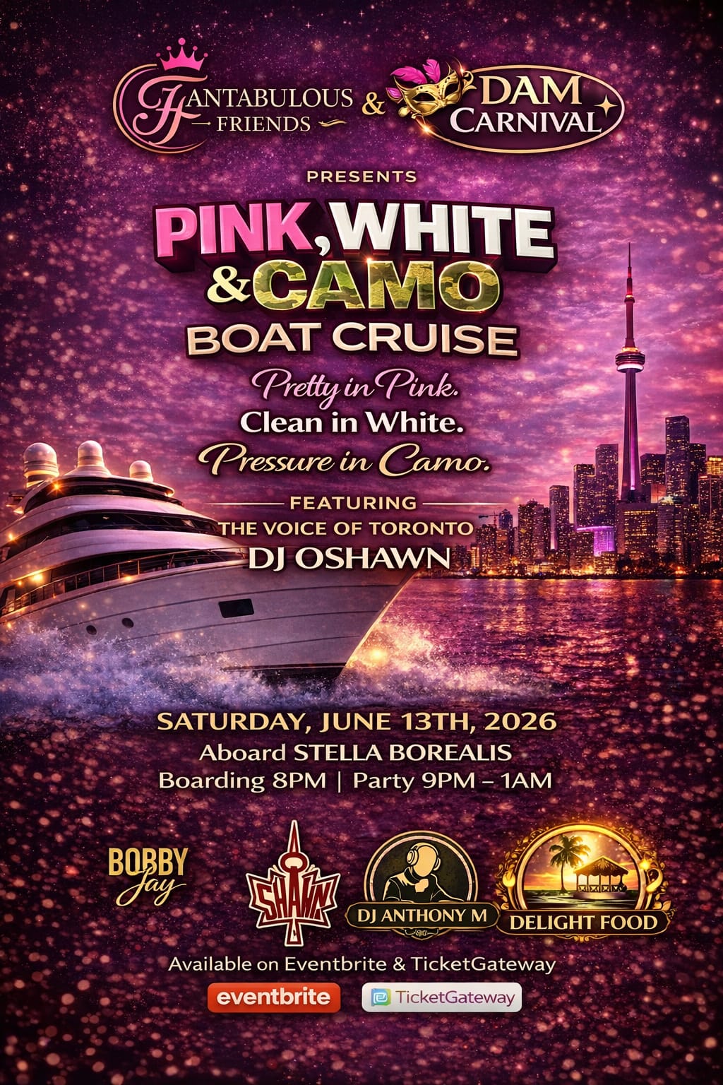 We are back!! Fantabulous Friends along with DAM Carnival is back with their grown and sexy annual experience turned all the way up!! Come pretty in pink, clean in white or gih dem pressure in camo! Let's get the summer started right, it's gonna be a vibe you don't want to miss. Featuring the voice of Toronto: DJ Oshawn, DJ Bobby Jay along with new and upcoming DJ Anthony M. Food inclusive event with food provided by Delight Caribbean Foods.