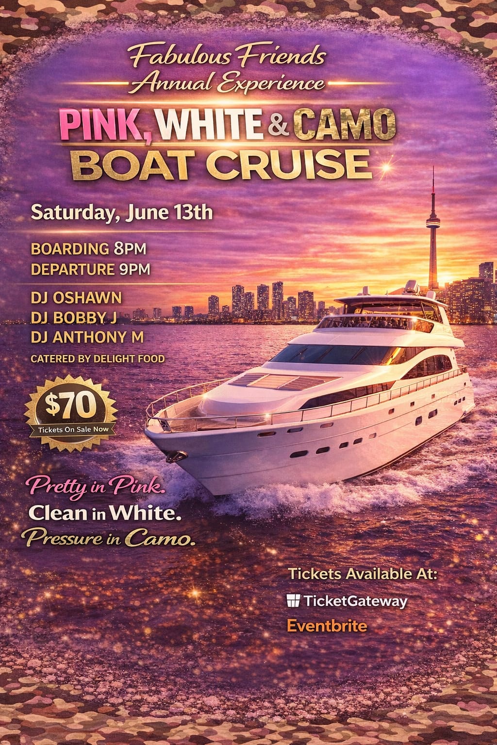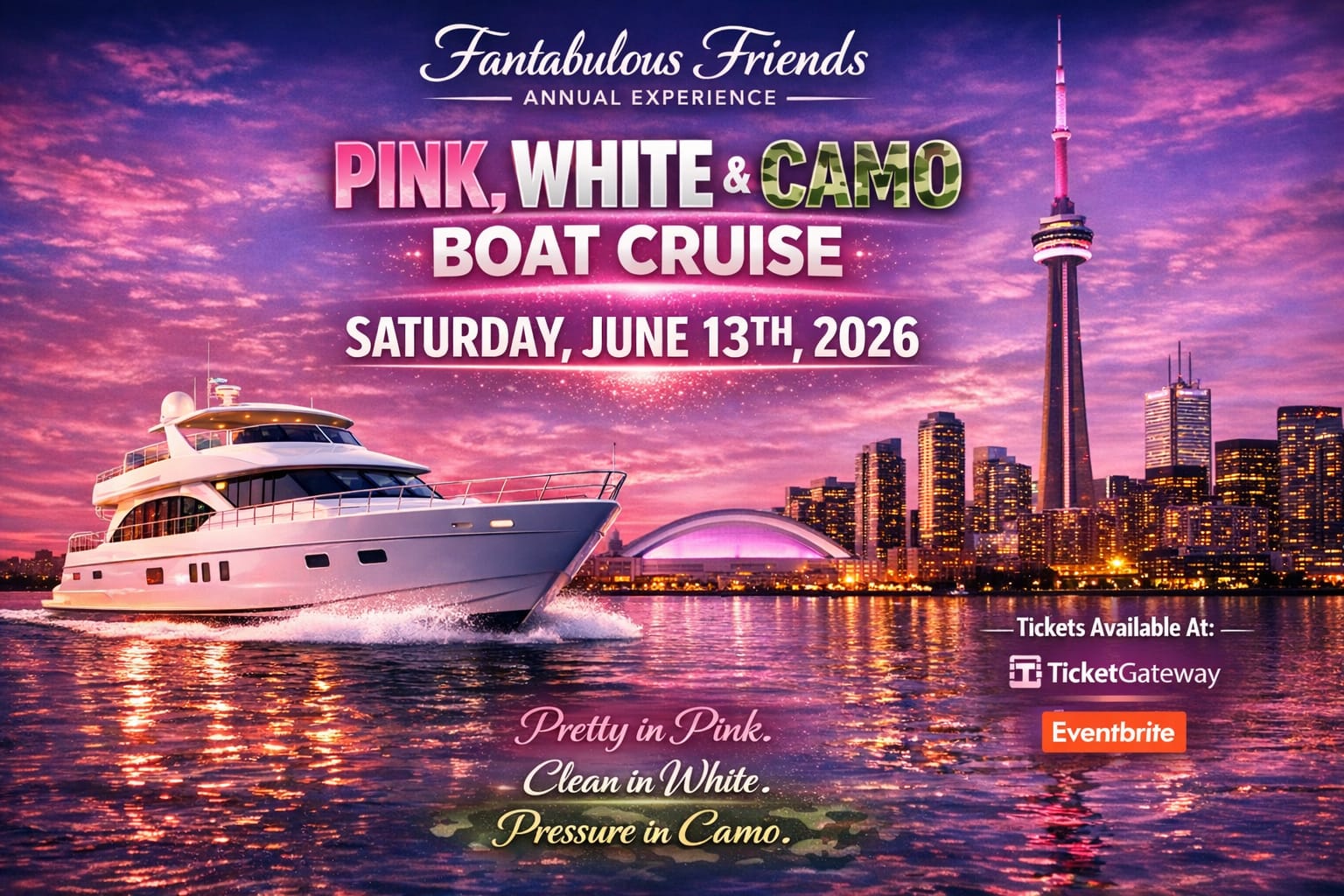 This event WILL sell out so don't delay... get your tickets today. Pink, White & Camo Boat cruise is where you need to be on Saturday 13th June 2026 aboard the Stella Borealis... Boarding: 8pm, sailing: 9pm -1 am..